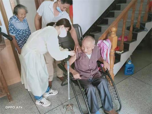 為了讓符合接種條件的長者盡早接種,井亭村成立了以村“兩委”成員和鄉賢理事會為主要組員的 " 老年人新冠疫苗接種攻堅小組 ",井亭村黨總支書記張信文擔任組長,組織轄區網格員和村民組長對長者開展一對一精準服務。轄區網格員以上門告知,短信、微信通知等多種形式,進行精準動員。在接種當天,轄區網格員和志愿者還將醫生接到有接種意愿的長者家中進行接種。