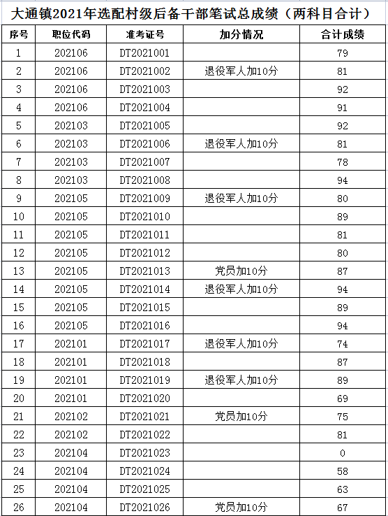 大通鎮(zhèn)2021年選配村級(jí)后備干部筆試、面試工作已結(jié)束,現(xiàn)將成績進(jìn)行公示。