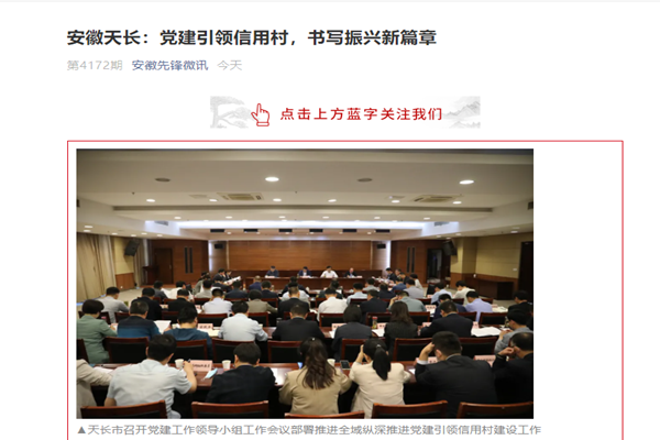 今年以來,天長市深入貫徹落實安徽省黨建引領信用村建設“1+5”工作方案和全省第二次聯席會議精神,全域縱深推進黨建引領信用村建設,率先完成黨建引領信用村信用評級工作,發放了全省首筆黨建引領信用村線上貸款。