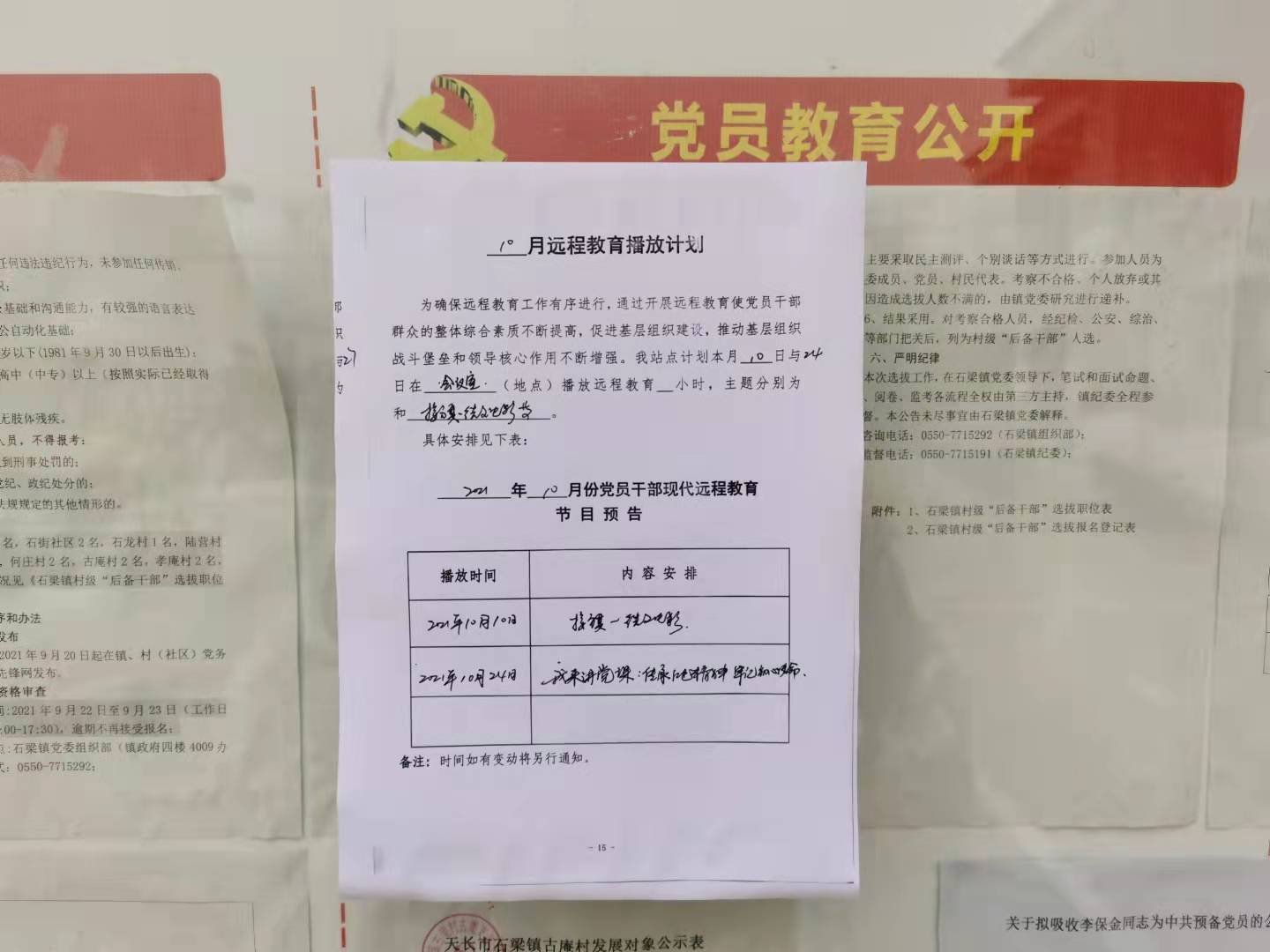 2021年10月份遠程教育播放計劃:定于2021年10月10日和10月24日在村黨員活動室播放遠程教育,內容分別為《接旗--微電影》和《我來講黨課:傳承紅色精神 牢記初心使命》,請大家屆時前來觀看。