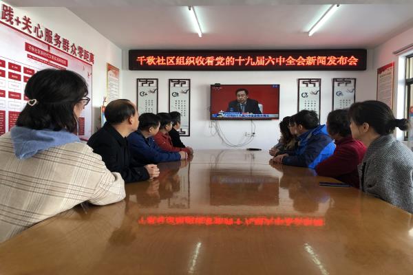 12日上午,中共中央舉行黨的十九屆六中全會新聞發(fā)布會,介紹黨的十九屆六中全會精神,并解答記者問題,千秋社區(qū)集中組織社區(qū)工作人員收看了新聞發(fā)布會實況。