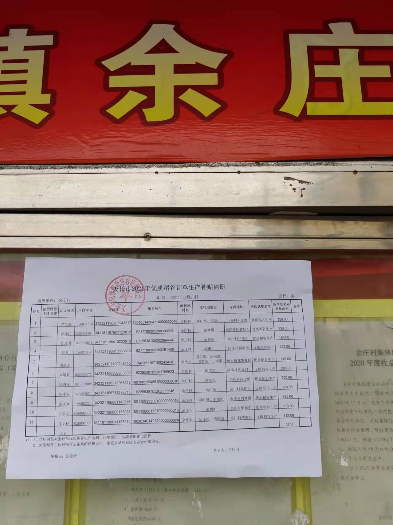 余莊村2021年優質稻谷訂單生產補貼共有11戶,具體情況如上圖所示。