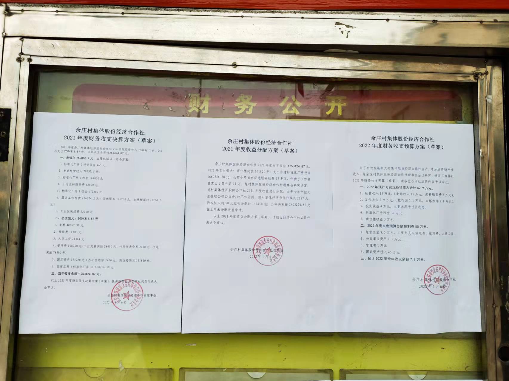 《余莊村集體股份經濟合作社2021年度財務收支決算方案(草案)》、《2021年度收益分配方案(草案)》及《2022年度財務收支預算方案(草案)》公示如上圖所示