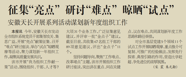 今年,安徽天長市發(fā)動全市組織系統(tǒng)黨員干部集智攻關、集思廣益,開展“亮點”獻策征集、召開“難點”研討座談、舉辦“試點”晾曬觀摩等活動,聚力謀劃新一年組織工作,凝聚高質(zhì)量發(fā)展共識。