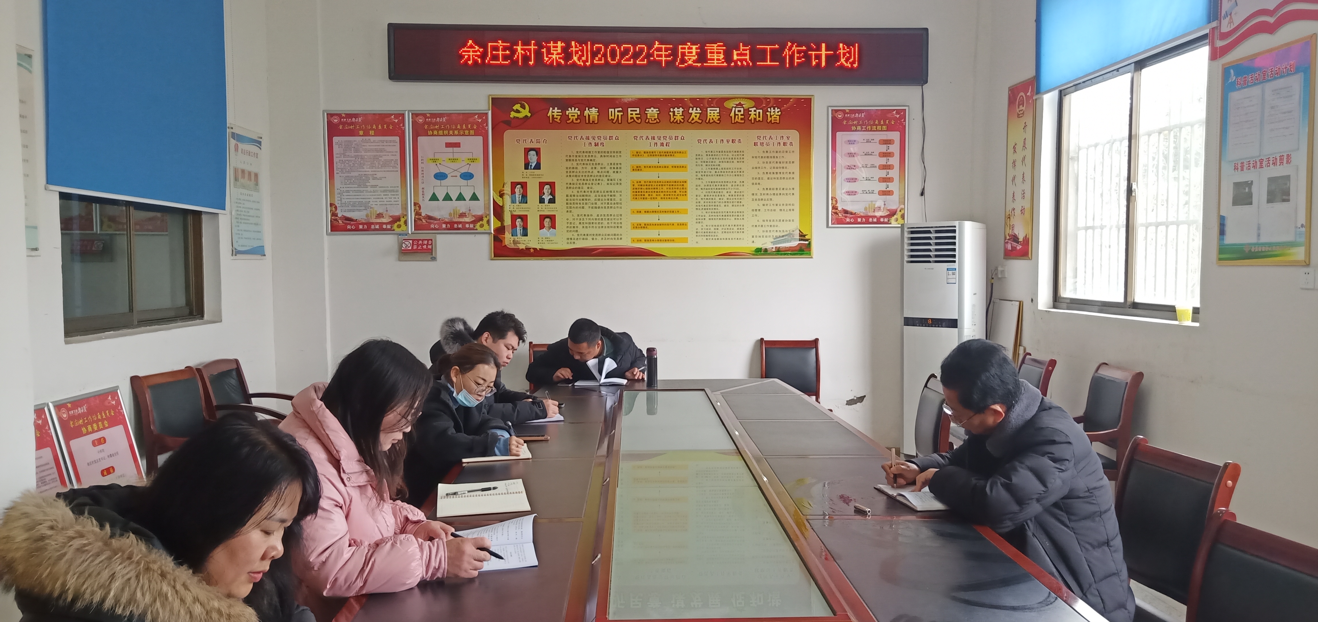2022年2月12日下午,余莊村召開會議謀劃2022年度工作計劃,結合黨員干部春訓班的學習要求,堅持立黨為公,執政為民,踐行全心全意為人民服務的根本宗旨。著力抓好春節后重點工作落實,包括小區周圍環境整治、村級集體經濟增收路徑、部分村民組征地計劃等重點事項。
