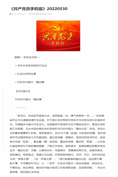 “陳書記,您說話聲音再大點,背再挺直一點,精氣神昂揚一點……”在安徽省天長市大通鎮連塘村會議室,村干部們正在幫助村黨總支書記陳玉忠糾正演講狀態。為增強鄉村振興內生動力,全面激發村黨組織書記干事創業活力,營造比學趕超工作氛圍,天長市啟動常態化村黨組織書記鄉村振興“擂臺比武”活動。活動分為初賽和復賽兩個階段。每季度首月,全市16個鎮(街道)分別組織初賽,各村黨組織書記圍繞各自工作專題述職,通過實地看、脫稿講、現場評的活動形式,促使各村互相“較勁”,拿出最“靚”的項目、最實的成果、最好的“答卷”,讓鄉親們直觀感受村干部的精神面貌,了解工作成效。每季度末,各鎮初賽冠軍集中參加全市“擂臺比武”決賽,以案例分析、專題演示、競賽演說等方式,談具體做法、創新模式、特色亮點,亮曬工作業績。評審團現場提問、點評、打分,全年共評選16名“季度之星”,1名“年度之星”。“我們就要借助擂臺比武,選出想干事、能干事、干成事的村書記,讓‘一把手’們在鄉村振興一線實戰演練、擔當作為、干事創業、樹立典型,推動鄉村振興各項工作取得新進展、實現新突破。”天長市委常委、組織部長王林說。