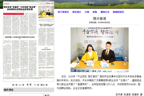 近日,2022年“千企百校 智匯滁州”高校畢業(yè)生集中云招引天長專場在安徽省滁州市舉辦。此次活動(dòng),天長市精選了天康集團(tuán)等8家企業(yè)作“云推介”,鑫鉑鋁業(yè)等12家企業(yè)開展了“直播帶崗”,全網(wǎng)在線觀看18萬人次,共收取簡歷2046份。圖為招聘會(huì)現(xiàn)場,企業(yè)正在直播帶崗。
