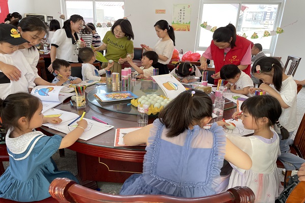 活動現場三:畫彩蛋。志愿者讓小朋友先在畫本上涂色,激發興趣,然后介紹了畫彩蛋所要用到的工具,并進行了涂色講解,并為每個孩子發放了彩蛋繪畫的筆和水彩顏料等工具。彩蛋繪畫活動充分調動了孩子的創造力,增強了孩子的動手能力,讓他們在游戲中學習,度過了一個快樂的六一。畫好的彩蛋用彩繩套住保護好,有的小朋友看到美麗的彩蛋,忍不住動手剝開吃了,并高興地說:“彩蛋真好吃”。