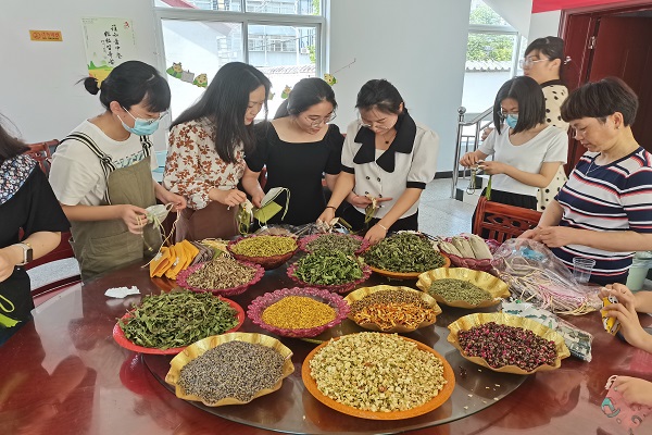 活動現場二:制作香囊。大家把提前準備好的玫瑰花、金銀花、茉莉花、橘子皮、蘇合香、艾草等各種香料小心地放入托盆中,根據各種人群的喜好和需求,制作出不同的香囊。志愿者陳曉青老師現場講解了香囊的歷史和文化意義,中國人佩戴香囊的歷史可以追溯到商周,到了唐宋時期,香囊成為彰顯身份的一種標志。另外,除了裝飾作用,有些香囊還具有防病抗疫的功效。