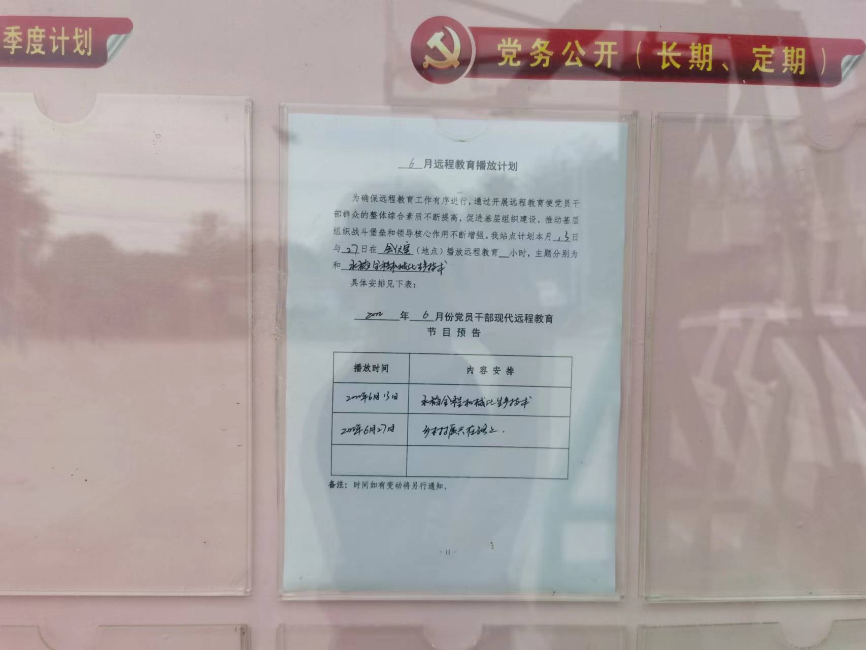 2022年6月份遠程教育播放計劃:定于2022年6月13日和6月27日在村黨員活動室播放遠程教育,內(nèi)容分別為《水稻全程機械化生產(chǎn)技術(shù)》和《鄉(xiāng)村振興在路上》,請大家屆時前來觀看。
