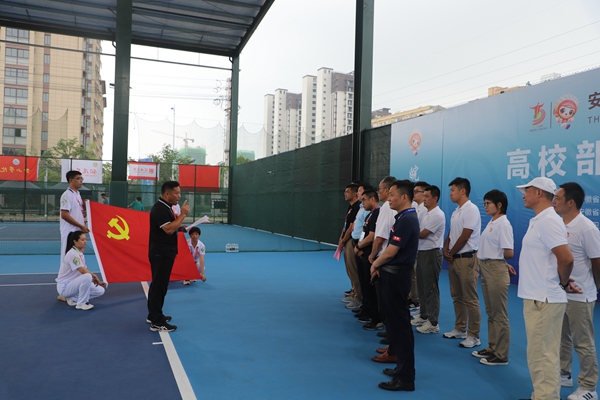 7月21日,在天長(zhǎng)市網(wǎng)球中心比賽場(chǎng)地,省第十五屆運(yùn)動(dòng)會(huì)高校部網(wǎng)球項(xiàng)目臨時(shí)黨支部開(kāi)展了黨課學(xué)習(xí)活動(dòng),黨支部書(shū)記高守東以《黨和國(guó)家領(lǐng)導(dǎo)人與網(wǎng)球情結(jié)》為題,為15名支部黨員上了一堂主題教育專題黨課。
