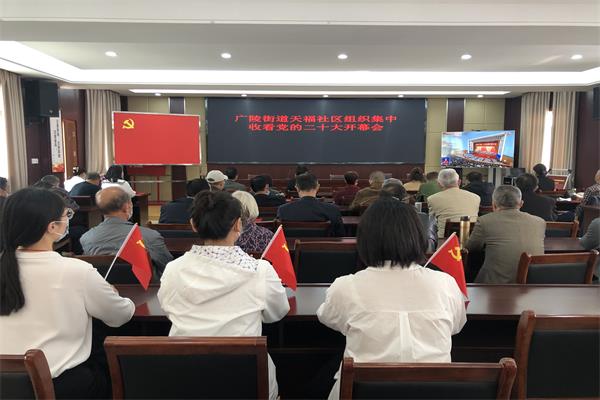 黨的二十大是全國人民寄予無限期望的盛會,廣陵街道各居(村)早早為迎接盛會做好了準備,大街小巷等都掛起了宣傳黨的二十大標語。黨員群眾坐在黨員活動室,認真收看大會,看到精彩處不時鼓掌喝彩。