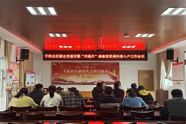 為進一步提升人民群眾安全感和政法隊伍滿意度,近日,千秋社區聯合黨委開展“雙提升”滿意度民調問卷入戶工作會議,組織開展群眾安全感滿意度重點戶走訪活動,以實際行動解決群眾難題、維護群眾利益、贏取群眾滿意。
