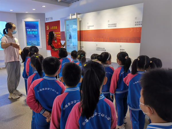 孩子們在老師和志愿者的帶領下參觀了天長市城市黨建之窗,圖文、音效和VR等現代化展館設備分別從“千秋福地 地久天長”“不忘初心、牢記使命”“紅色領航 一居一品”三個方面向孩子們展示了智慧黨建引領天長城市的建設發展。隨后志愿者分別為孩子們講解了天長的人文、地理和歷史由來——羅炳輝將軍、“壽昌孝母”“包拯智破牛舌案”“茉莉歌鄉”等,讓孩子們切身感受到了在中國共產黨領導下中國和天長的發展變化。