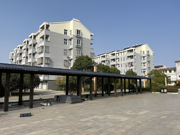 大壙圩社區居民住宅區前有一處活動廣場,廣場內有二條木質長廊,長廊內設有板凳,方便居民群眾乘涼、散步時休息。但由于長廊當時建設時未建頂棚,不少居民反映夏天不能遮陽,雨天也不能避雨,希望社區能進一步完善長廊的設施。收到居民的意見后,大壙圩社區高度重視,上下合力聯動,著力解決居民群眾反映的問題,聯系相關部門和施工單位,開始對木廊實施頂棚加蓋。