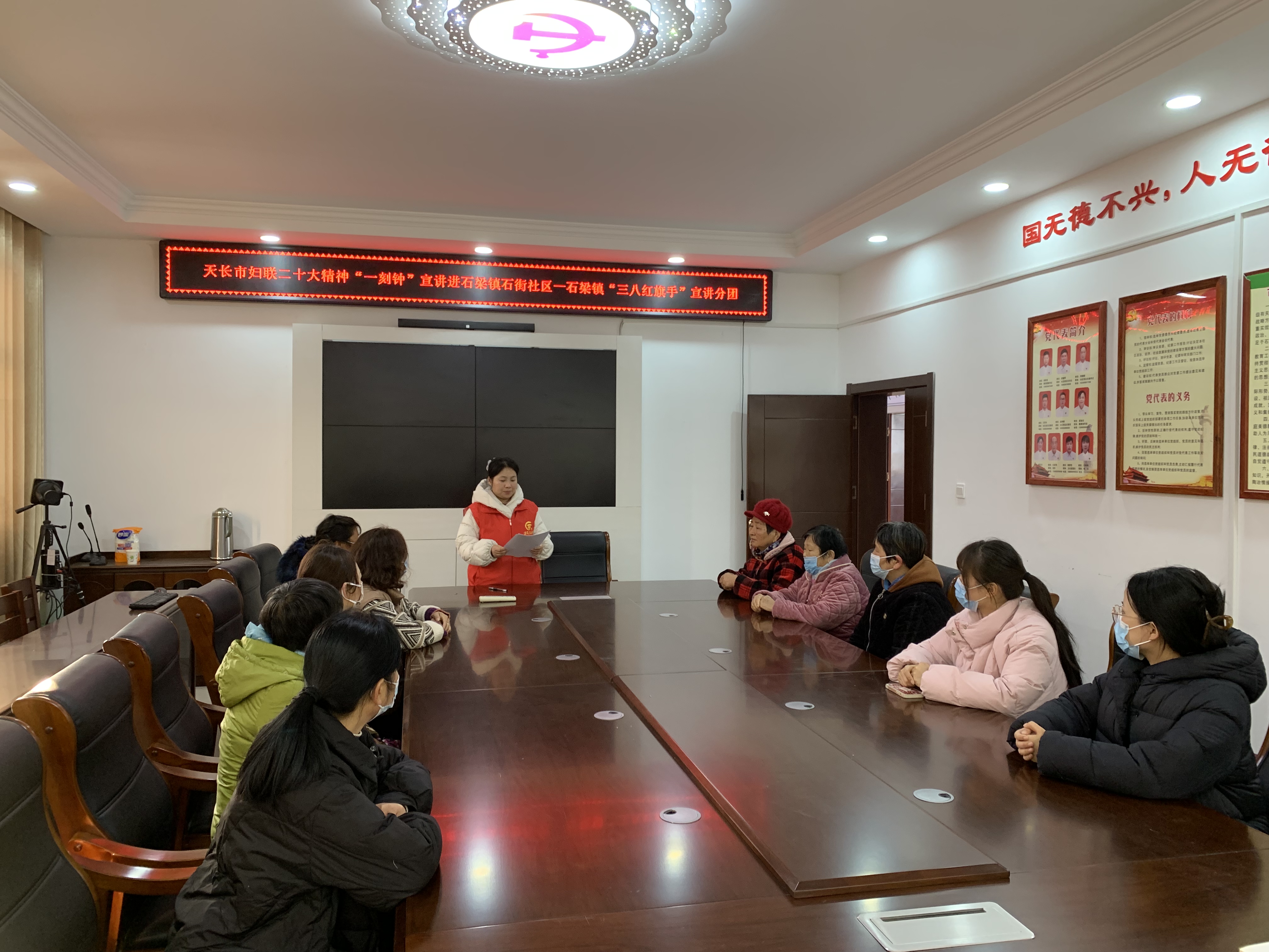 12月12日,石梁鎮婦聯在石街社區開展“黨的二十大精神進社區”宣講活動,由石梁鎮“三八紅旗手”宣講分團成員、婦聯執委沈蕓帶領社區婦女群眾學習貫徹黨的二十大精神。