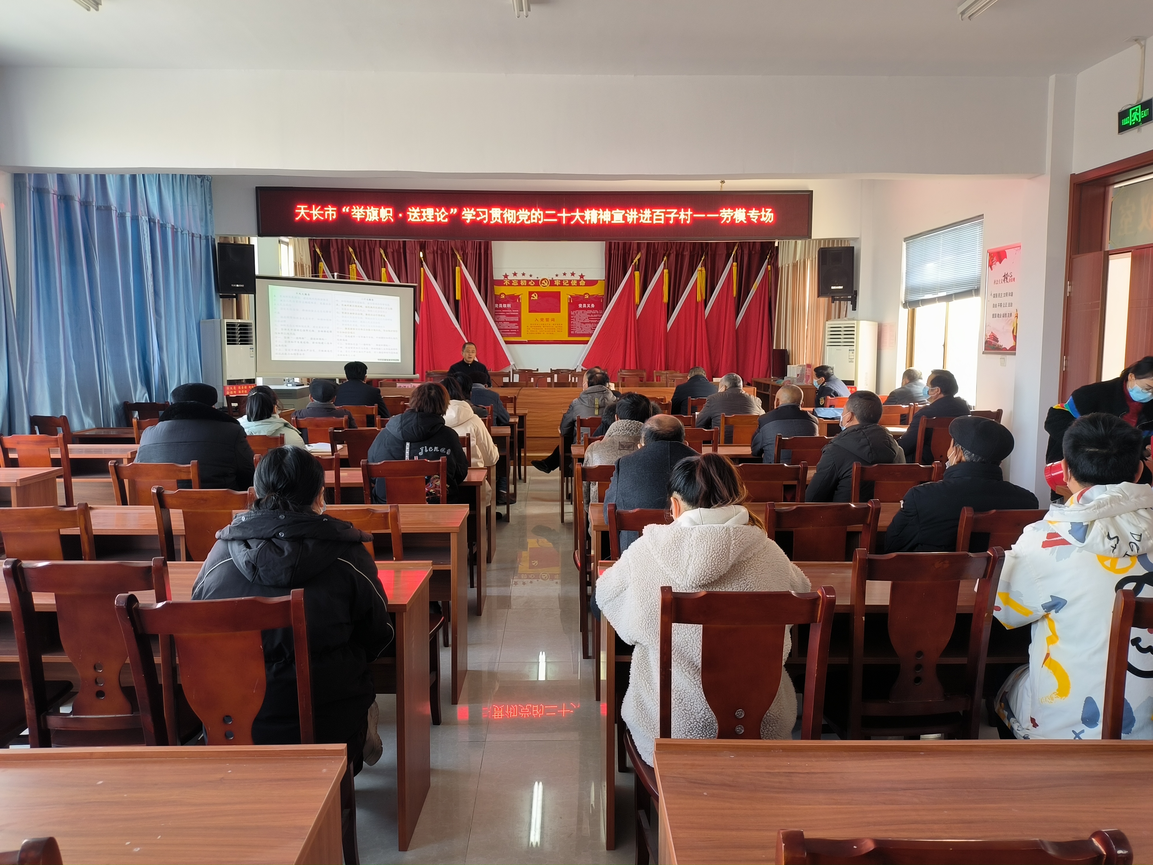 為了進一步學習好、宣傳好、貫徹好黨的二十大精神,12月20日下午,天長市“舉旗幟·送理論”學習貫徹黨的二十大精神宣講百子村報告會在百子村二樓會議室舉行,天長市市委黨校校長趙士鵬為百子村全體黨員授課。