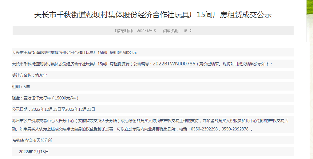 為進(jìn)一步擴(kuò)大村集體收入,本次招租通過(guò)滁州市公共交易中心天長(zhǎng)分中心平臺(tái)公開(kāi)招租,合同金額較之前有較大提高。