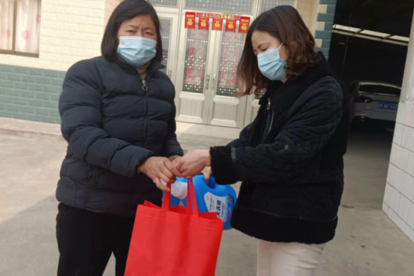 光明村對轄區內的重點人群進行走訪,慰問他們最近的生活情況,并且為他們發放洗衣液等生活用品。