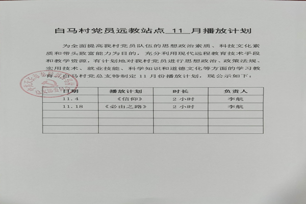 為全面提高白馬村黨員隊(duì)伍的思想政治素質(zhì)、科技文化素質(zhì)和帶頭致富能力,充分利用現(xiàn)代遠(yuǎn)程教育技術(shù)手段和教學(xué)資源,有計(jì)劃地對(duì)我村黨員進(jìn)行思想政治、政策法規(guī)、實(shí)用技術(shù)、就業(yè)技能、科學(xué)知識(shí)和道德文化等方面的學(xué)習(xí)教育。白馬村黨總支特制定11月份播放計(jì)劃: