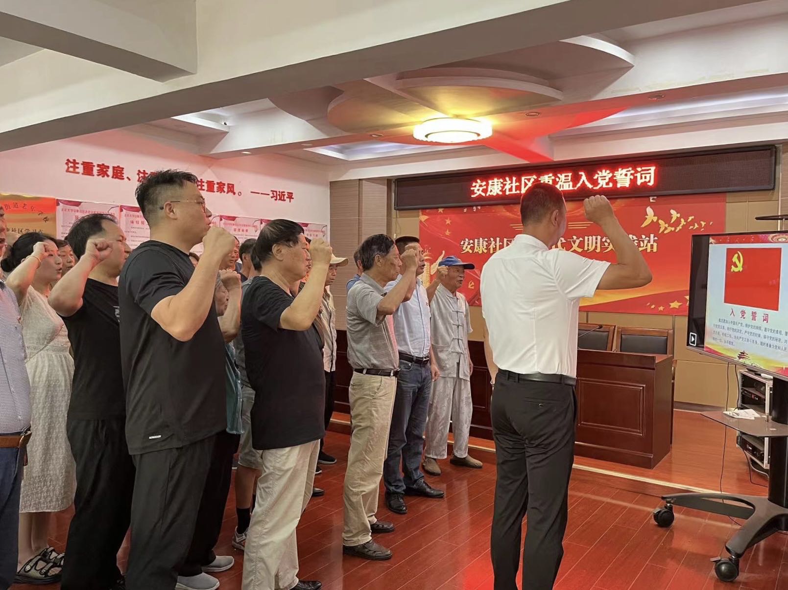 緊接著,安康社區(qū)黨總支書記和蹲點(diǎn)干部帶領(lǐng)廣大黨員同志們重溫入黨誓詞。“我志愿加入中國(guó)共產(chǎn)黨,擁護(hù)黨的綱領(lǐng),遵守黨的章程,履行黨員義務(wù)……”鏗鏘有力的入黨誓詞響徹黨群陣地,有的黨員如今已白發(fā)蒼顏,但初心不變。