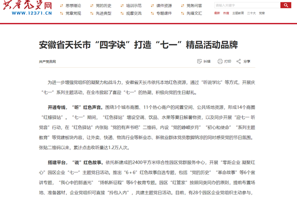 為進一步增強黨組織的凝聚力和戰斗力,安徽省天長市依托本地紅色資源,通過“聽說學比”等方式,開展慶“七一”系列主題活動,在全市掀起了喜迎“七一”的熱潮,積極向黨的生日獻禮。