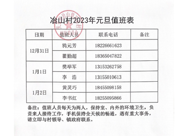 2023年元旦假期為:12月31日至1月2日(星期六、星期天、星期一),共放假3天。村部每天安排有值班人員2名,各位村民有事可以隨時到村部辦理。