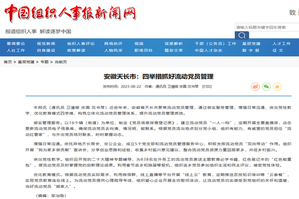 近些年來,安徽省天長市聚焦流動黨員管理,通過做實服務管理、增強日常溝通、突出黨性教學、優化教育模式四舉措,構筑立體化流動黨員管理體系,提升流動黨員管理質效。