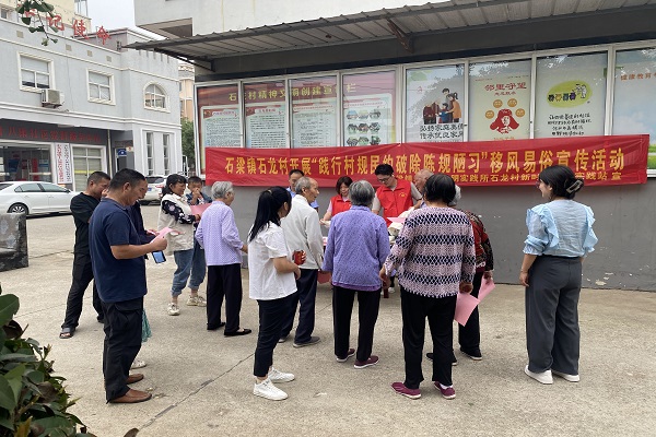 2023年中秋、國慶雙節期間,石龍村村委聯合石龍村新時代文明實踐站開展“踐行村規民約破除陳規陋習”移風易俗宣傳活動。引導居民群眾破除鋪張浪費、婚喪大操大辦等陳規陋習,推動移風易俗,樹立勤儉節約、文明健康的生活方式。
