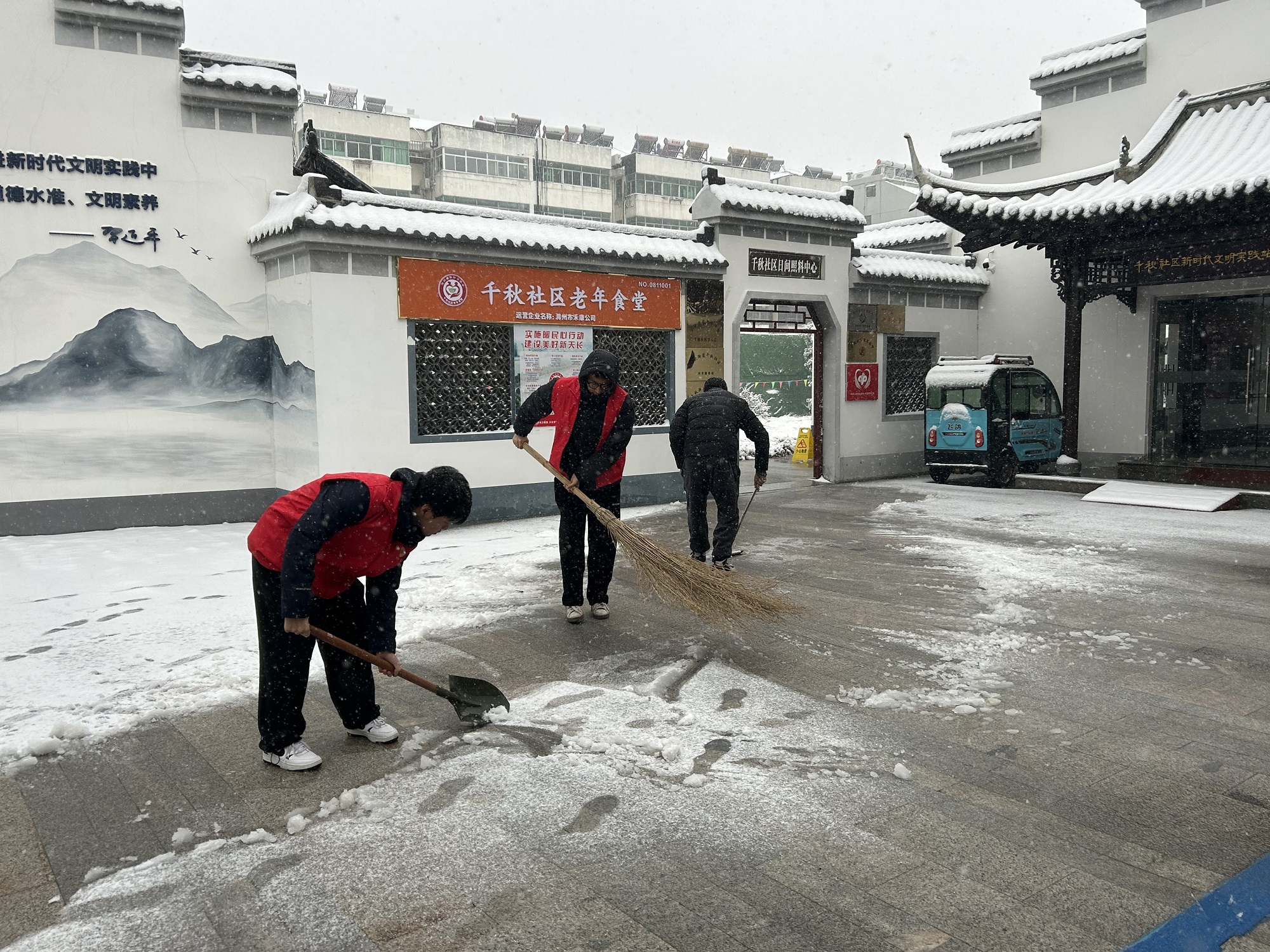 12月18日,降雪不期而至。雪后的千秋社區銀裝素裹、分外美麗,但道路大量積雪,給群眾出行帶來很大的不便。為了確保社區居民的生活秩序和安全,千秋社區黨員干部及轄區黨員志愿者積極行動起來,組織掃雪除冰工作,為民服務。