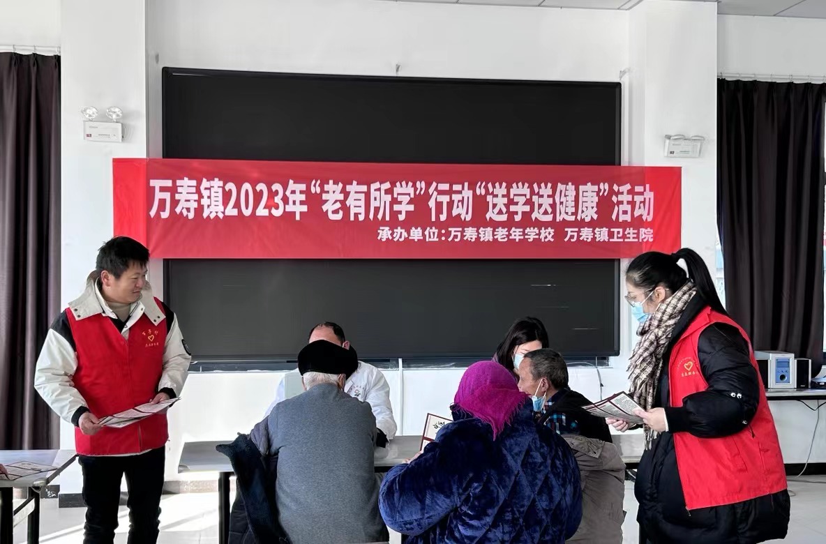 12月21日上午,萬壽鎮老年學校在鎮敬老院開展“送學送健康”活動,邀請鎮衛生院醫務人員開展測血壓義診服務,并組織志愿者進行健康科普服務宣傳。