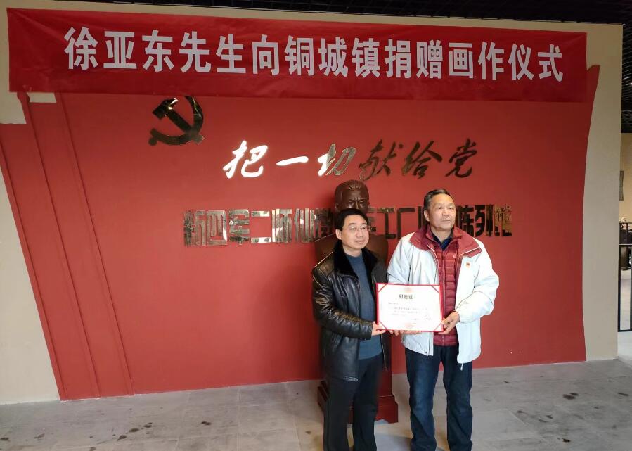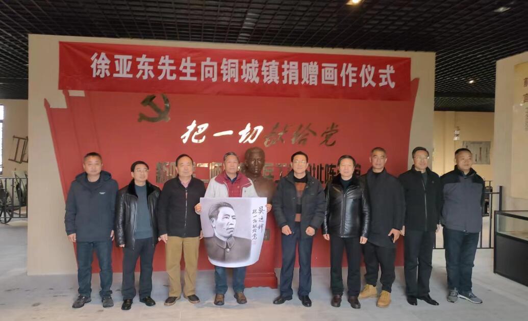 滁州市、天長市新四軍研究會領導一行攜書畫家徐亞東先生向高廟社區(qū)新四軍二師兵工廠紀念館捐贈吳運鐸畫像,鎮(zhèn)人大主席韓湘貴、組織部部長毛昌龍陪同。