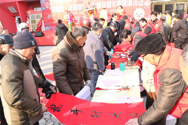 上午的活動持續三個小時,廣場上掛滿了紅彤彤的春聯,地上鋪滿了各式各樣的“福”字。現場氣氛熱烈而祥和,充滿了濃濃的年味。收到春聯和“福”字的群眾滿心歡喜,紛紛表示謝意。老人們歡快地說:“感謝老年學校的教師們新春時刻還想著我們大家,這字寫得真漂亮,這樣的春聯,比在外面買的更有意義。”一同前來的小朋友在體驗完剪窗花后開心地說:“春節是我國的傳統節日,學校里我們學到剪窗花、寫春聯這類文化習俗,今天在爺爺奶奶的示范下,通過實踐的方式對文化傳承有了更深的理解。”下午的舞腰鼓、戲曲、歌曲、舞蹈等16個節目讓觀眾們連連叫好,老年學員們把所學所獲通過演出的形式為街坊鄰居帶來歡樂。