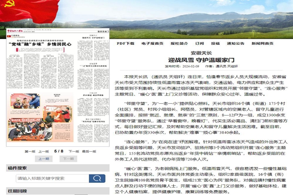 連日來,恰逢春節返鄉人員大規模流動,安徽省天長市受大范圍持續性低溫雨雪冰凍天氣影響,交通運輸、電力供應和群眾生產生活等受到不利影響。天長市通過組織基層黨組織和黨員開展“鄰里守望”、“連心服務”主題黨日、“暖心‘醫’靠”上門義診等活動,保障群眾安心過年、溫暖過冬。
