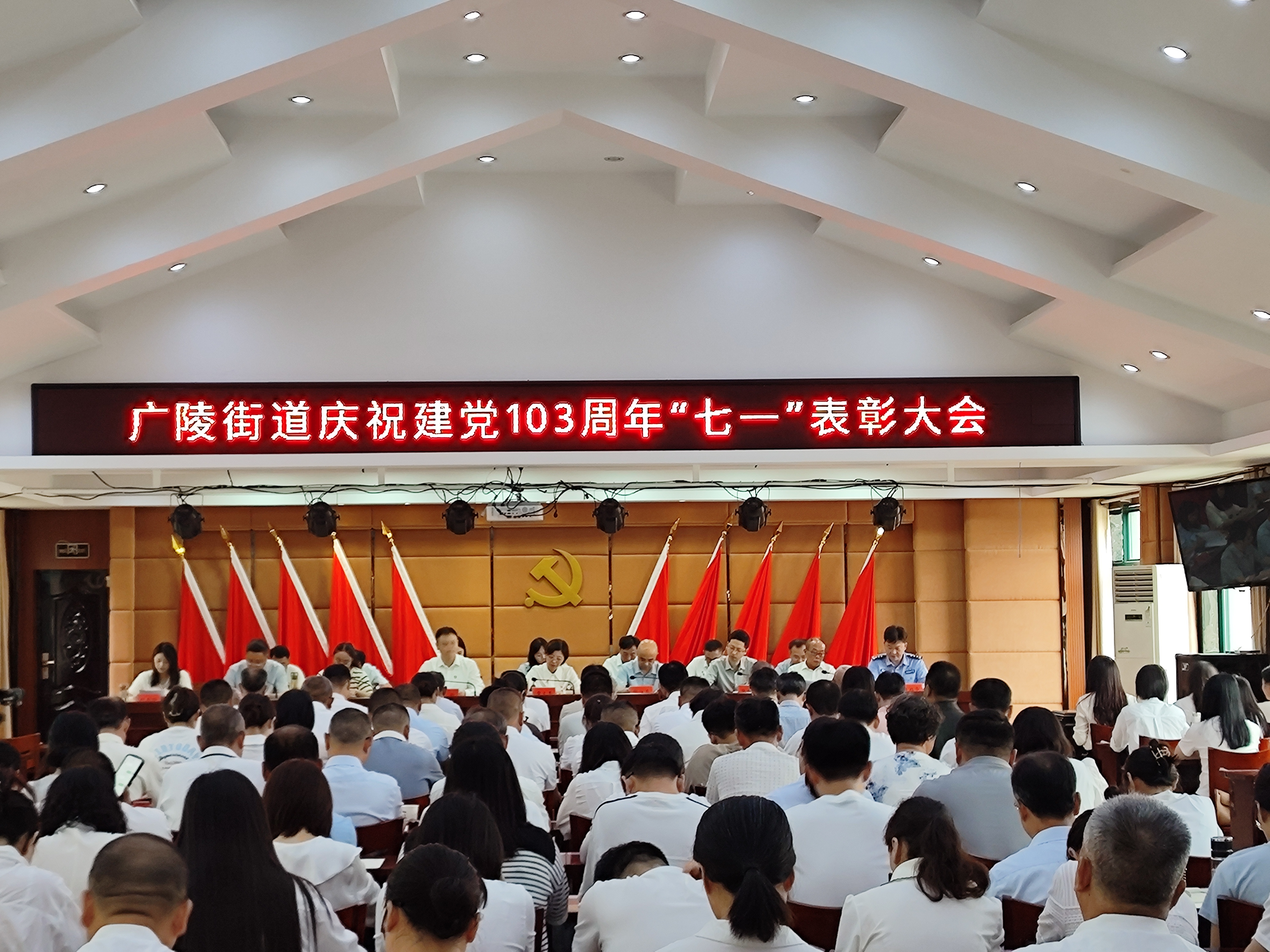 為激勵廣陵街道各級黨組織和廣大黨員干部不忘初心、牢記使命,營造銳意進取、奮發向上的干事創業氛圍。6月28日上午,天長市廣陵街道召開了慶祝建黨103周年七一表彰暨黨紀學習教育警示大會。街道全體黨政班子成員、部門負責人、各基層黨組織書記、“兩優一先”獲得者及部分“光榮在黨50年”的老黨員代表參加大會。市委組織部、市委社工部相關負責人應邀出席表彰大會。