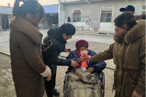 2024年1月29日上午,張營村開展“久久紅包”走訪派送活動。張營村按照“久久紅包”發放規定,對轄區內90周歲以上老人,其在家庭鄉風文明中村規民約、贍養老人、支持村兩委工作等方面評分較高的,給予每人每月90元的紅包獎勵。張營村班子成員來到馬營組102歲老人張鳳英家,為她送上新年祝福及1080元的“久久紅包”。在新春佳節來臨之際,老人的臉上洋溢著幸福、滿意的笑容。