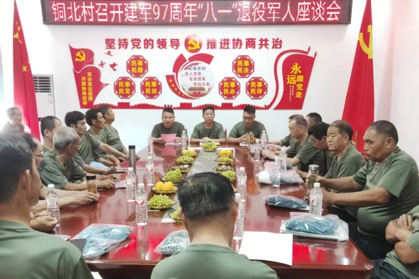 2024年8月1日,銅北村召開建軍97周年“八一”退役軍人座談會,通過座談會的形式表達對退役軍人的關懷和敬意,在座談會上大家共同暢談部隊生活,體現了銅北村對軍人的深厚感情,也進一步鞏固了軍民之間的魚水深情,弘揚了擁軍優屬的光榮傳統。