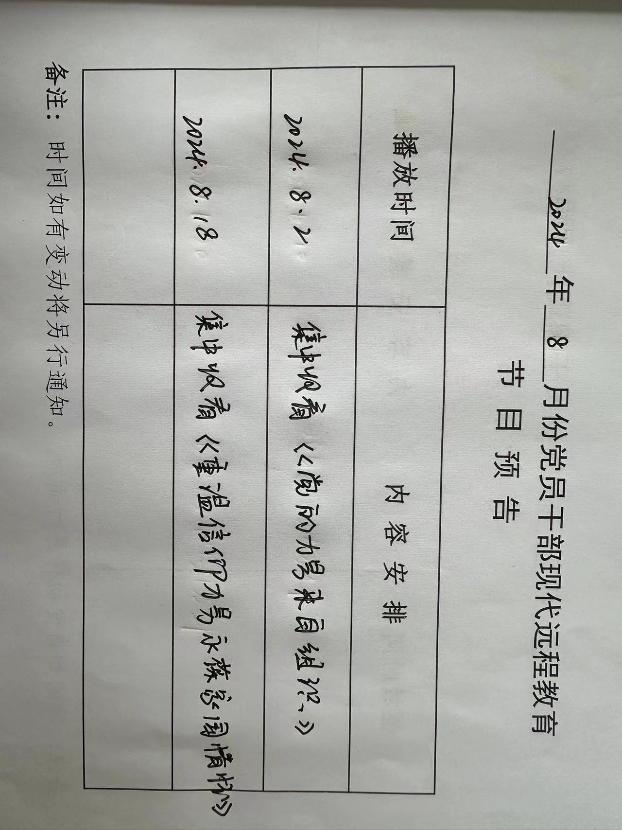 銅城鎮(zhèn)蘇橋村2024年8月遠(yuǎn)程教育播放計(jì)劃如上圖所示。
