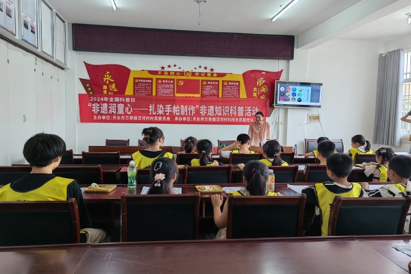 2024年9月15日上午,在汊河村村部開展“非遺潤童心——扎染手帕制作”非遺知識科普活動。本次活動邀請了草木拾叁印染工作室主理人陳妍老師,負責本次非遺知識科普講解。老師會向孩子們詳細介紹扎染的歷史淵源,講述扎染在中國的發展歷程,從古代的起源到現代的傳承,讓孩子們對扎染的歷史有一個清晰的認識。例如,扎染在秦漢時期就已經開始出現,是我國傳統的印染工藝之一,有著悠久的歷史和深厚的文化底蘊。隨后,給孩子們分發扎染所需的材料和工具,如白色手帕、染料、皮筋、手套等,并確保每個孩子都有足夠的材料進行創作。最后孩子們完成作品,露出滿意的笑容。