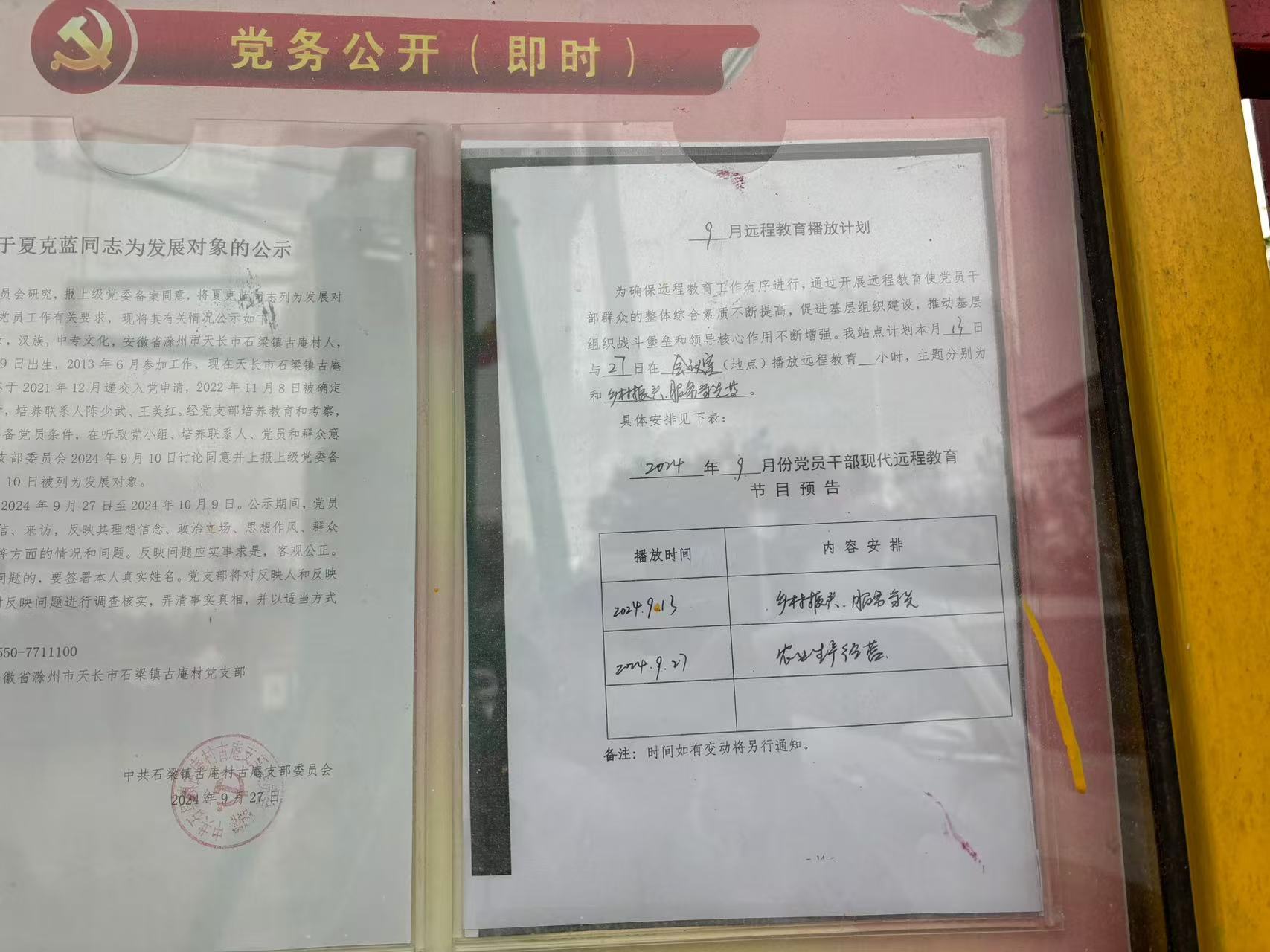 2024年9月份遠程教育播放計劃:定于2024年9月13日和9月27日在村黨員活動室播放遠程教育,內容分別為《鄉村振興,服務當先》和《農業生產經營》,請大家屆時前來觀看。