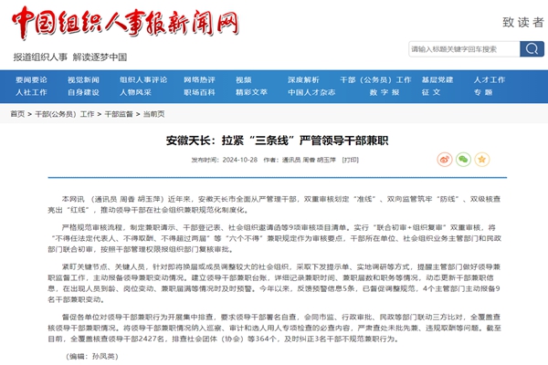 近年來,安徽天長市全面從嚴管理干部,雙重審核劃定“準線”、雙向監管筑牢“防線”、雙級核查亮出“紅線”,推動領導干部在社會組織兼職規范化制度化。