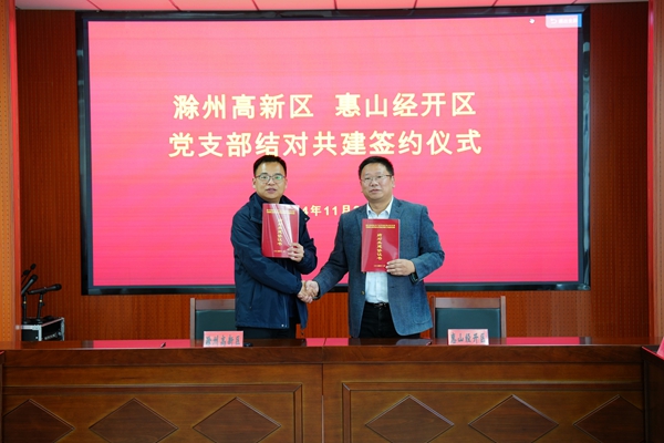 期間,惠山經開區代表團與滁州高新區相關負責同志進行座談交流。座談會上,大家共同學習了習近平總書記關于國家級經開區工作的重要指示精神,雙方園區就黨建工作聯建計劃、企業發展扶持政策、產業鏈協同發展等事項進行了深入交流,分享各自的經驗和做法。雙方機關黨支部從組織建設、隊伍建設、黨風廉政建設等6個方面簽訂了年度共建計劃。