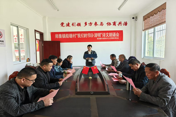 詩文誦讀,傳承文化。為了更好地感受和弘揚清明傳統文化,鄭集鎮船塘村新時代文明實踐站舉辦了一場別開生面的詩文誦讀活動。活動現場,來自船塘村的黨員群眾齊聚一堂,以飽滿的熱情誦讀了《清明》《寒食》《破陣子?春景》等經典詩詞,以及《緬懷先烈》《清明的雨》等現代詩文,用抑揚頓挫的聲音、真摯的情感,生動地展現了清明文化的豐富內涵和獨特魅力。