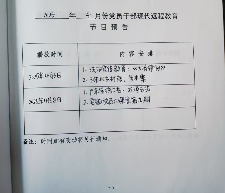 銅城鎮(zhèn)余莊村2025年4月遠(yuǎn)程教育播放計(jì)劃如上圖所示。
