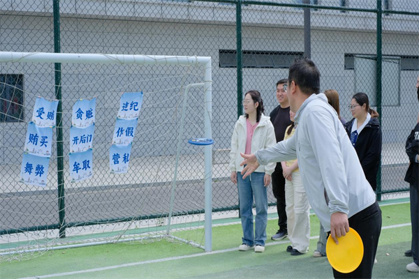 第三環節為“飛盤打靶?知廉揚清”。此環節創新性地將廉潔教育與趣味運動相結合。九宮格上粘貼有“違紀”“舞弊”等字樣,隊員們通過飛盤擊打這些負面詞匯,象征著對這些行為的堅決抵制。成功完成挑戰的隊員獲得了“廉”字印章,寓意著對廉潔精神的堅守與弘揚,彰顯五四青年保持初心、砥礪奮進的青春力量。