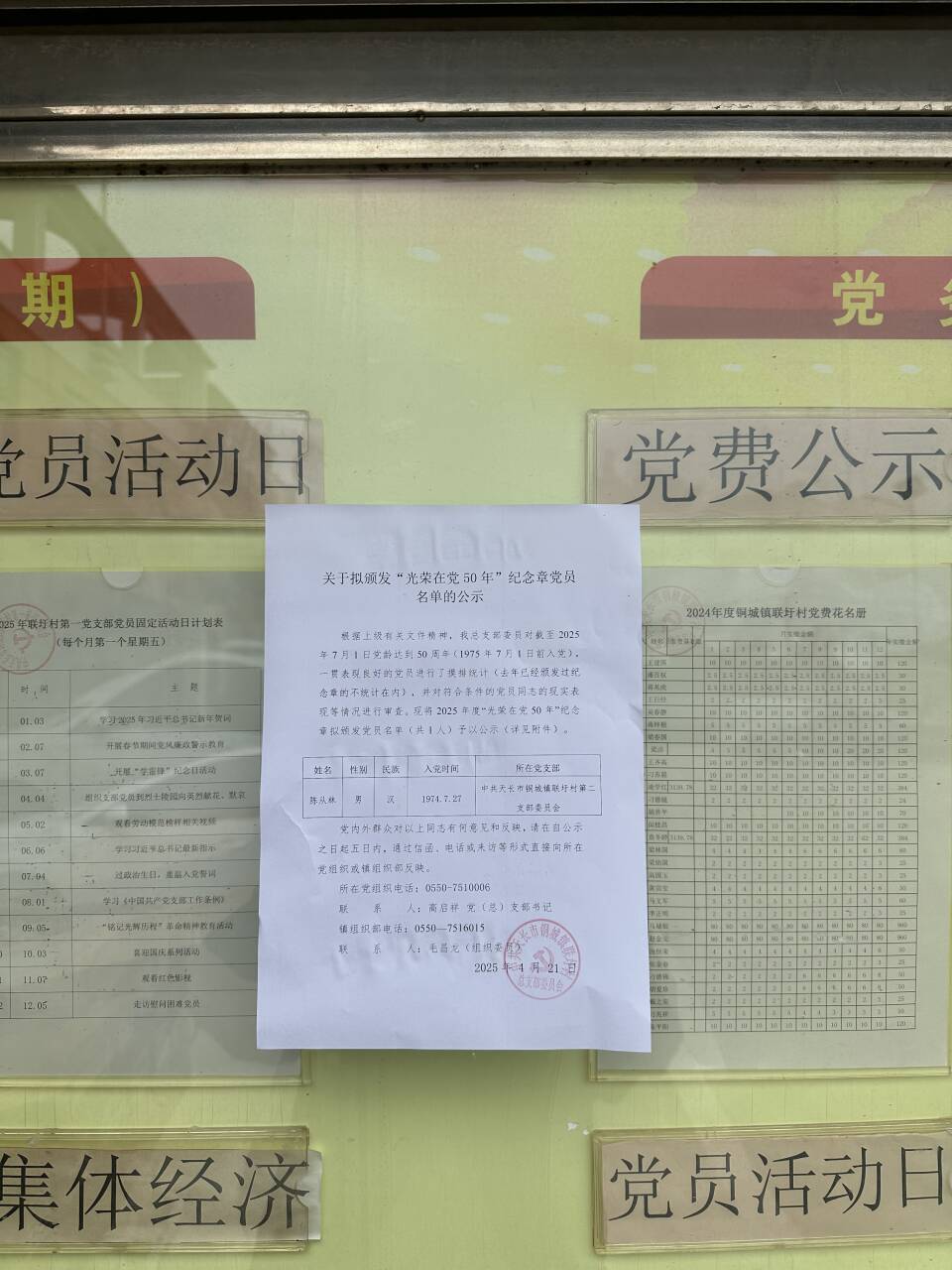 根據上級文件精神指示,聯圩村黨總支截至2025年7月黨齡達到50周年(即1975年7月1日前入黨)一貫表現良好的黨員進行摸排統計(去年已經頒發紀念章的不在內),并對符合條件的黨員于2025年4月21日召開黨總支審查會議,現將2025年度“光榮在黨50年”紀念章擬頒發黨員名單(共1人)予以公示。