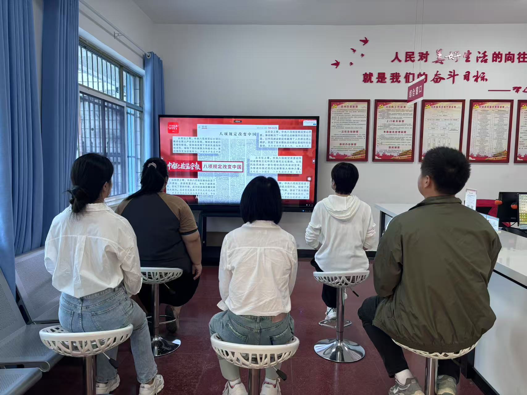 2025年5月14日上午,振興社區組織“兩委”工作人員在線學習“八項規定改變中國”系列視頻。