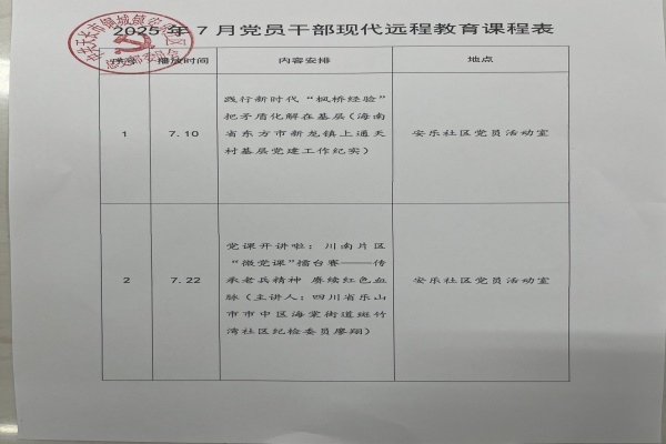 銅城鎮安樂社區2025年7月黨員干部現代遠程教育課程表如圖所示。